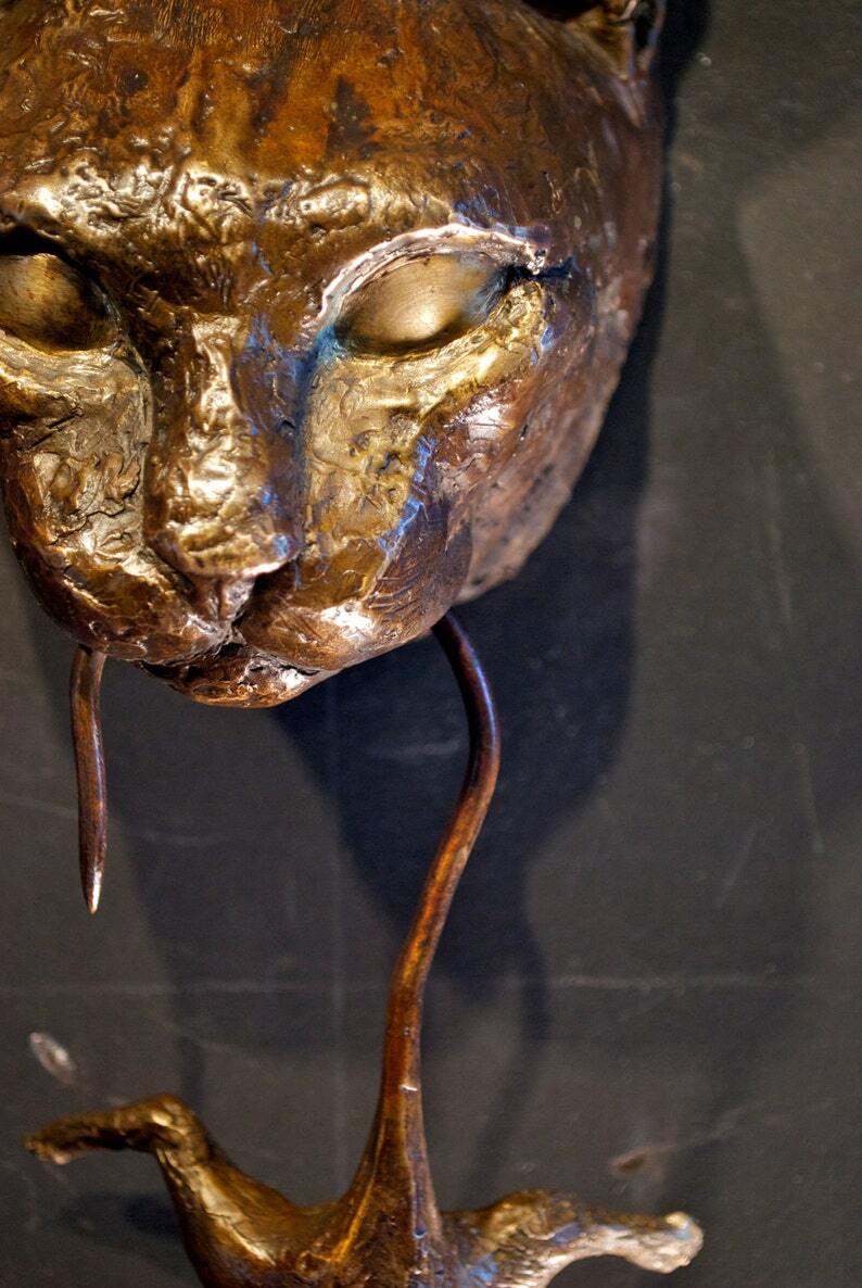 The sculpture is life-size (cat head roughly 4-5" each way). Can be easily mounted on a front door using brass screws, which we will provide, or on a board for wall mounting.